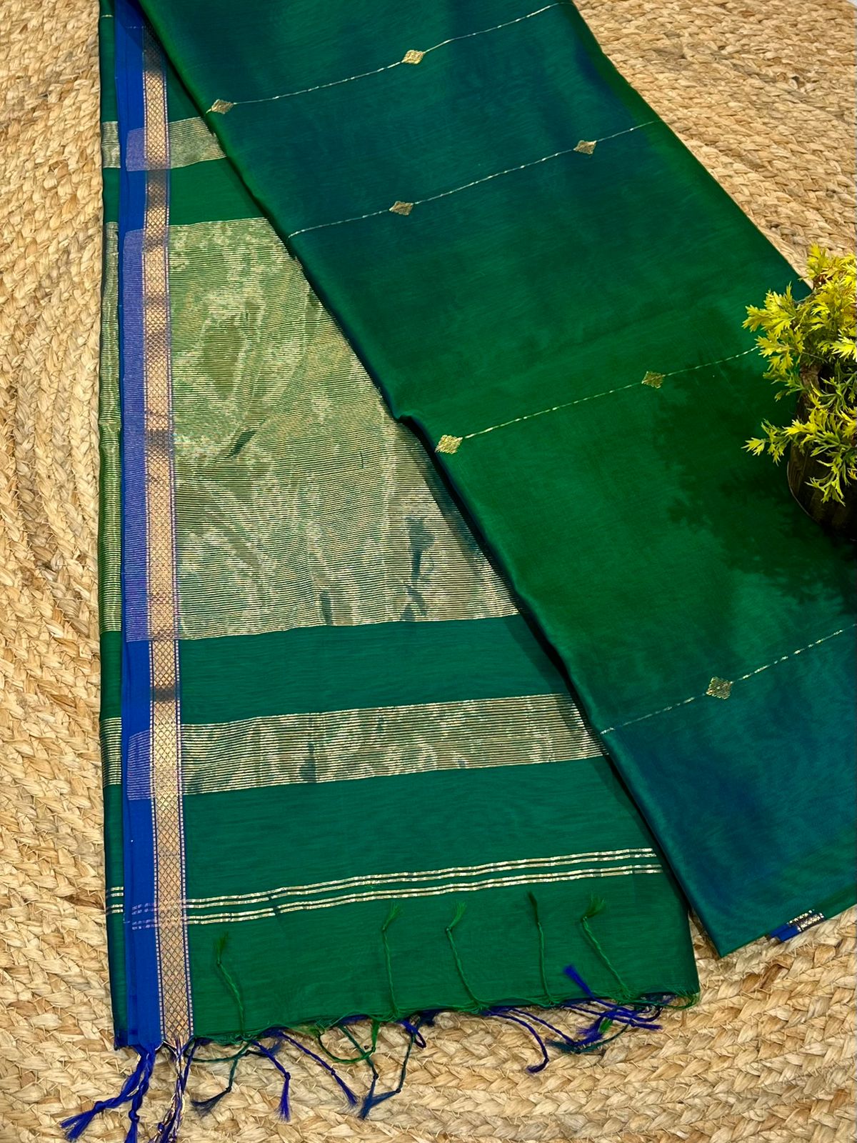 This traditional Maheshwari saree has a small border and all-over buttas golden zari weaving. Handwoven with care, the saree reflects the rich weaving heritage of Maheshwar, known for its lightweight texture and timeless appeal. Crafted in a silk-cotton blend, it offers both comfort and grace, making it ideal for festive occasions, cultural gatherings, and formal wear.